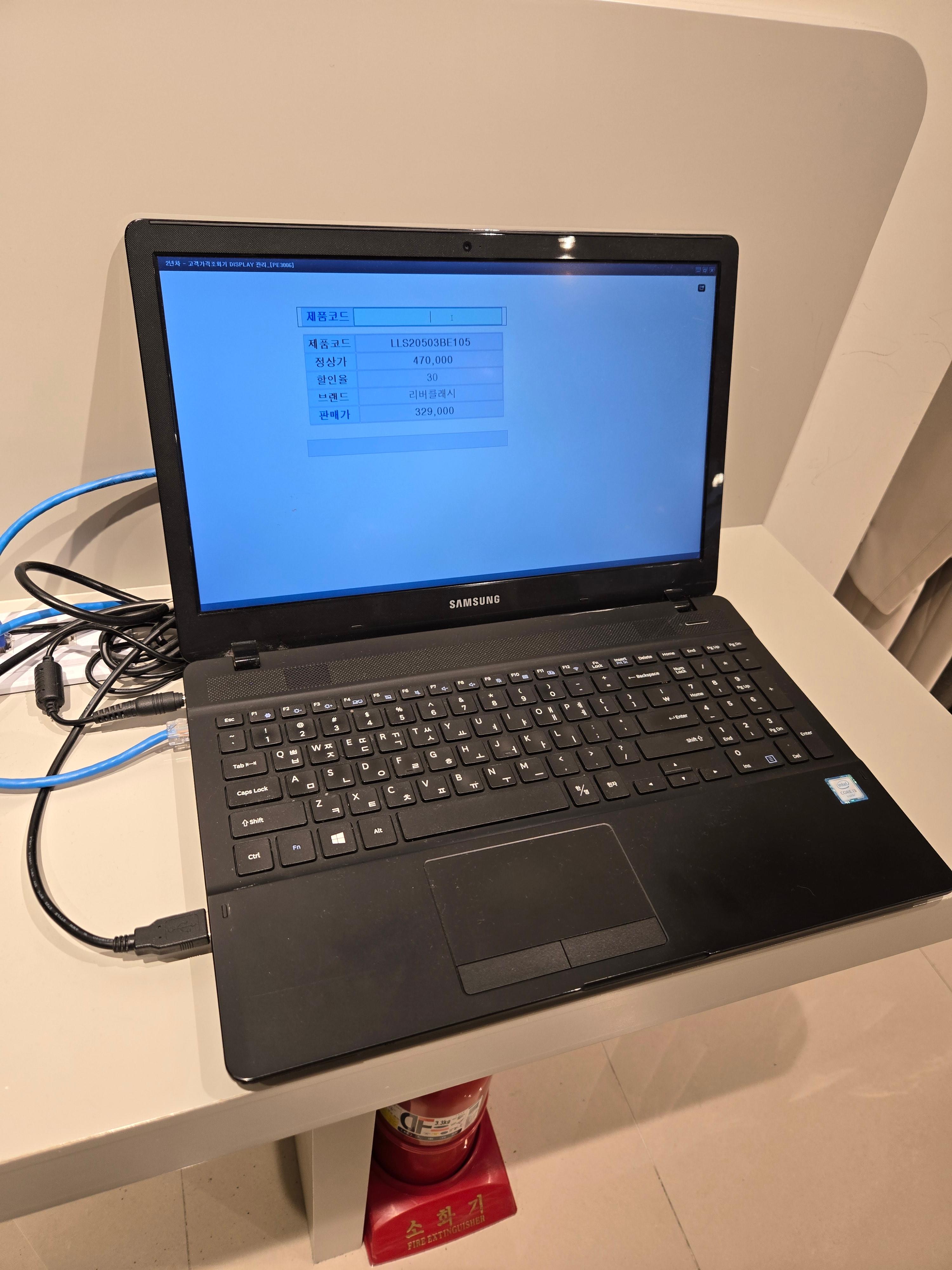 옷을 가지고 노트북 옆에 있는 바코드에 찍으면 할인된 금액이 보여요.