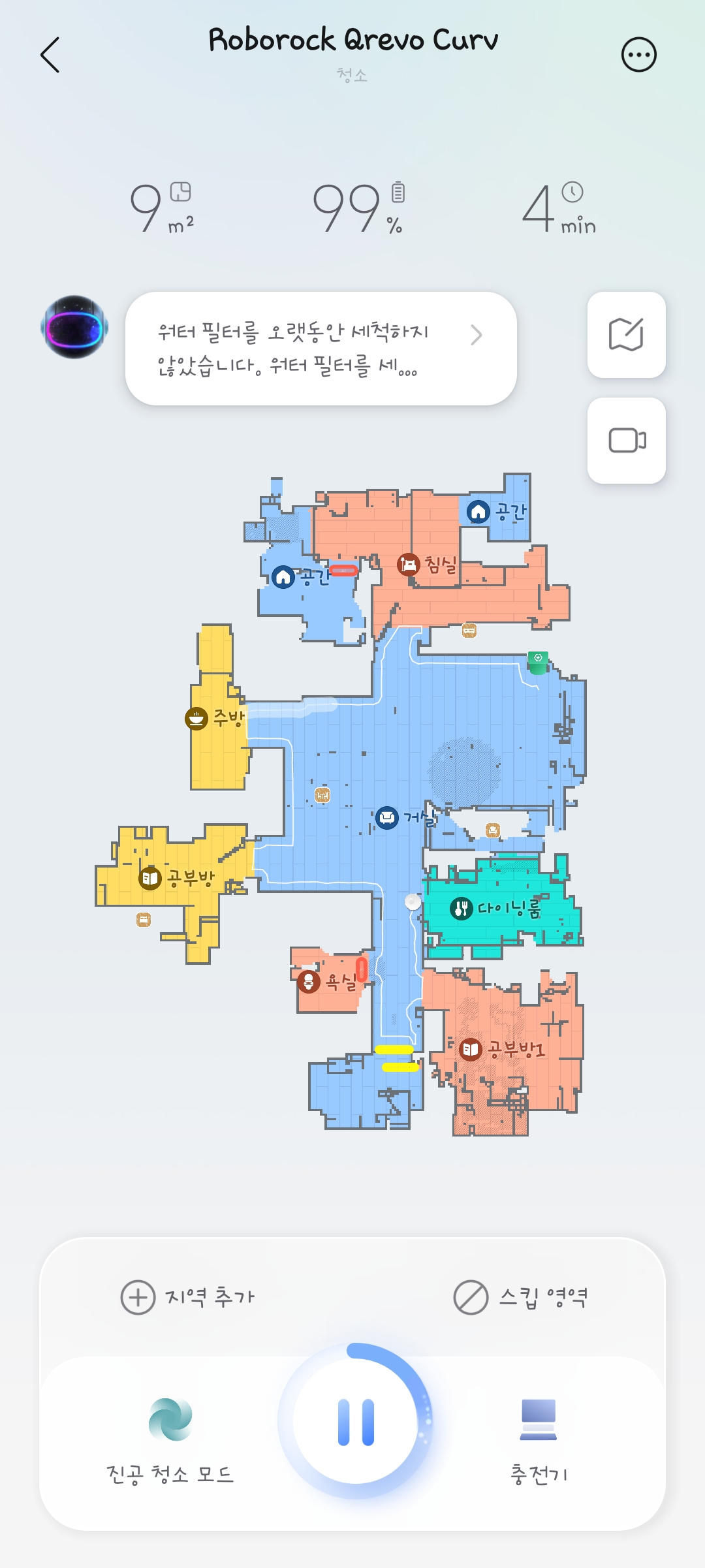 먼저, 로보락 특유의 AI 기반 감지 기술 덕분에 거실부터 주방, 공부방까지 진짜 구석구석 완벽 청소를 해줬어요.