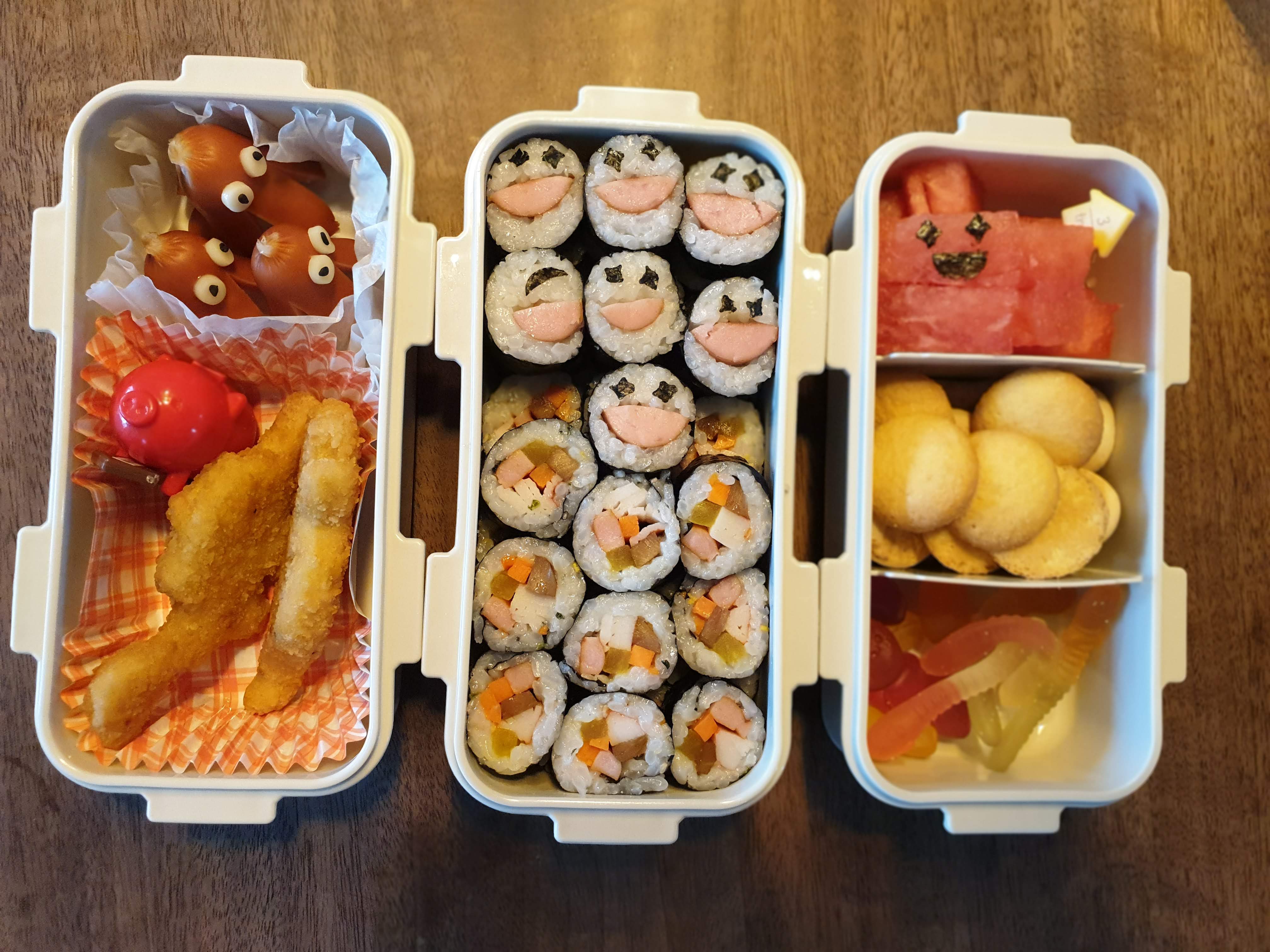 눈이나 입 모양을 간단히 꾸며주는 것만으로도 충분히 귀여운 도시락이 될 수 있어요.