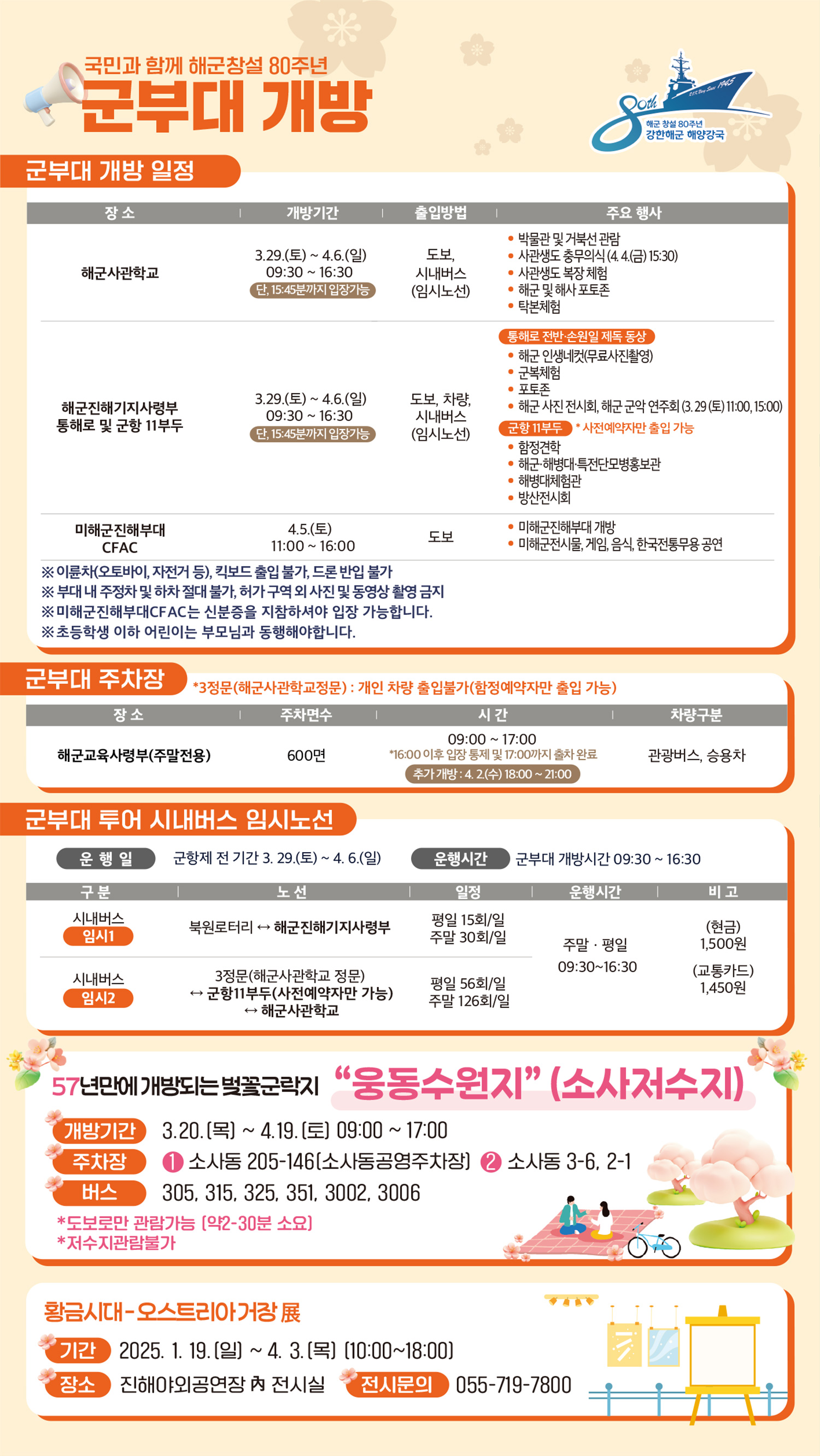 | 4월 1일(화) | 해군기지 개방 시작 | 진해 해군사령부 | 신분증 필참 |