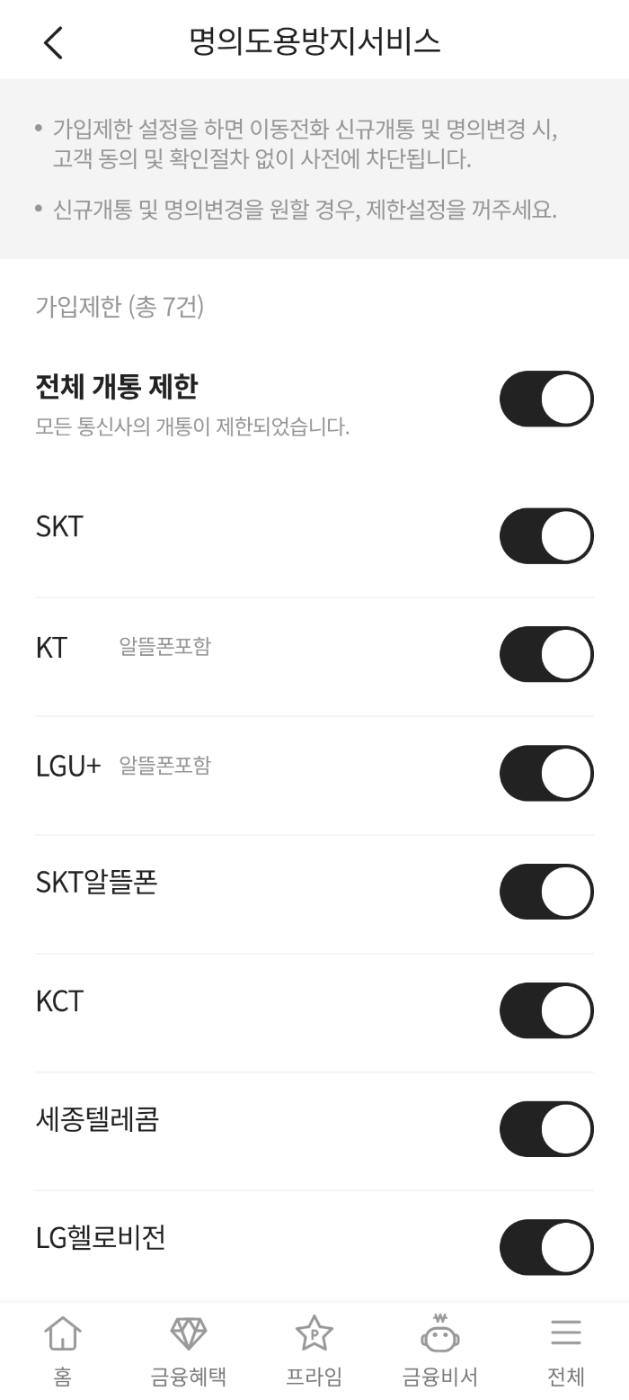 | 기능 | 타인이 내 명의로 인증하는 것을 사전 차단 |